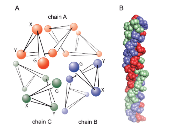 膠原在結(jié)構(gòu)上由三個自身按左螺旋排列的多肽鏈構(gòu)成,三條相互獨立的膠原蛋白肽鏈依靠甘氨酸之間形成的氫鍵維系三股螺旋相互纏繞的結(jié)構(gòu)。眾多膠原蛋白大分子又可彼此并排形成纖維互相交聯(lián)的結(jié)構(gòu),使最終產(chǎn)物具備較高機(jī)械強(qiáng)度。