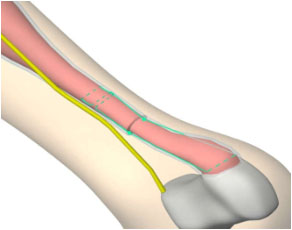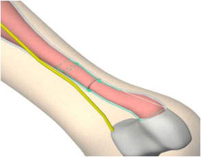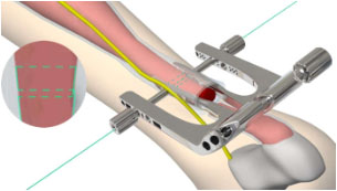3、將骨科定位片(不帶各個(gè)導(dǎo)向筒)內(nèi)側(cè)臂插入跟腱筋膜鞘內(nèi),剛插入時(shí)兩內(nèi)側(cè)臂距離很小,插入過程中兩內(nèi)側(cè)臂距離通過主體連接桿逐漸增大,使跟腱位于兩內(nèi)側(cè)臂之間。如圖2所示。