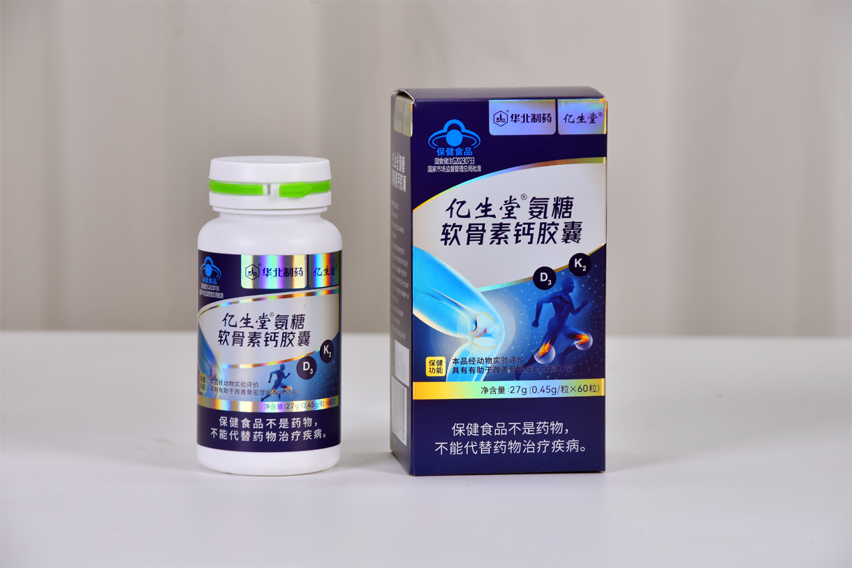 億生堂@氨糖軟骨素鈣膠囊主要原料為碳酸鈣、D-氨基葡萄糖鹽酸鹽、硫酸軟骨素鈉、維生素K2、維生素D3,適用于中老年人,具有有助于改善骨密度的保健功能。