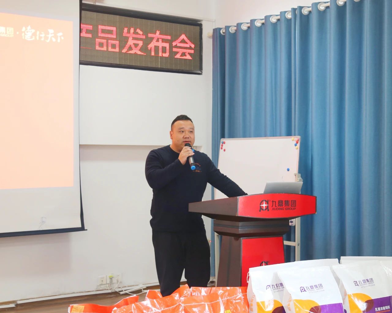 會議開始,集團總裁喻文鋒先生、副總裁徐波先生及參會的集團領導和各營銷公司總經(jīng)理們一同登上講臺,輕觸啟動按鈕,隆重宣告預配料線超吉大系列新產(chǎn)品—超吉大教槽料、CJD優(yōu)乳寶、CJD仔豬寶的正式發(fā)布。